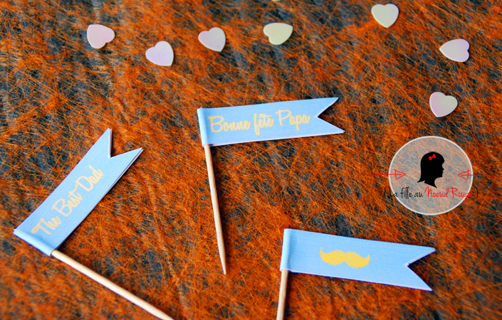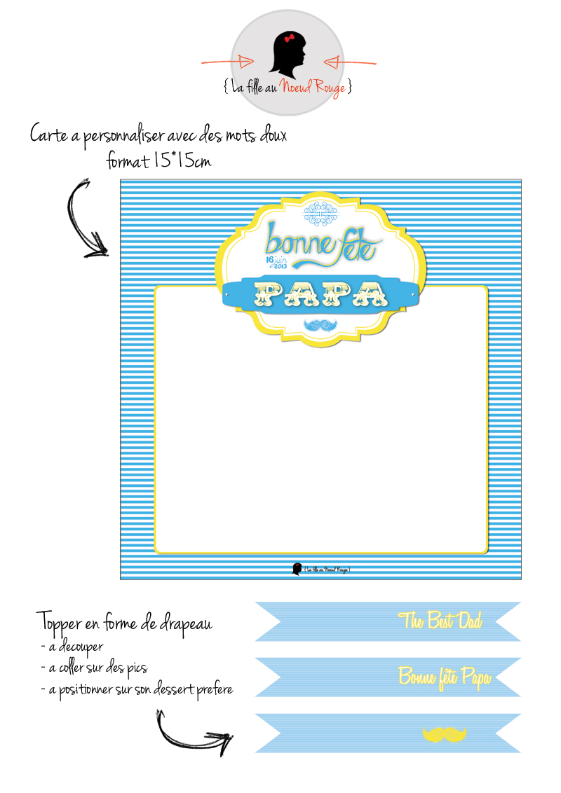À deux jours de la fête des pères et pour mettre à l’honneur votre super papa comme il se doit, La fille au Noeud Rouge vous propose de télécharger gratuitement une carte élégante à personnaliser qui accompagnera le cadeau parfait sans oublier des supers topper en forme de drapeau pour les papas gourmands (à mettre sur le pain au chocolat au petit-déjeuner ou encore sur le dessert préféré de votre PAPA à la fin du repas)
