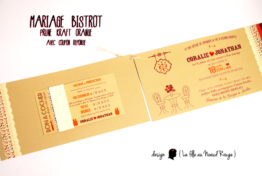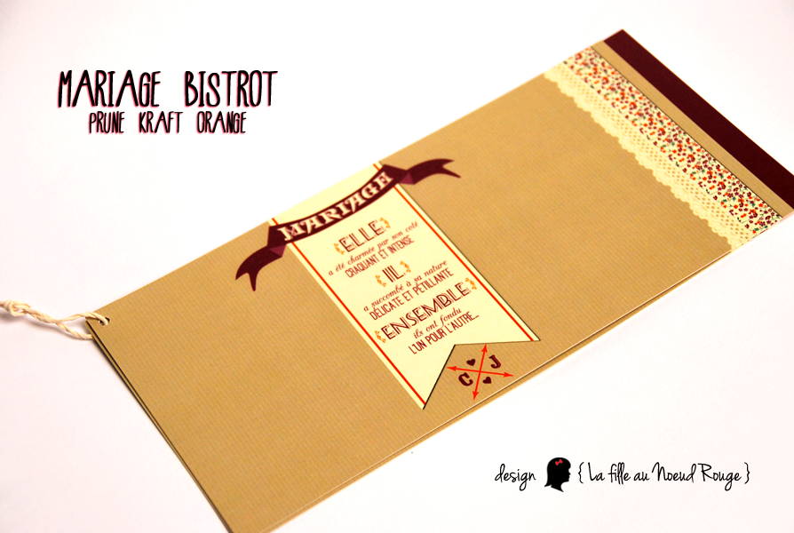 | Faire-part de mariage sur-mesure « bistrot automnal »dans un style rétro Couleurs : prune, kraft, orange, liberty Accessoires : cordelette ancienne Création de logo des mariés, différentes polices de tailles différentes www.lafilleaunoeudrouge.fr