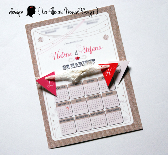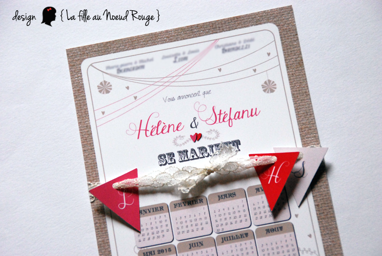 | Faire-part de mariage champêtre sur-mesure calendrier Thème : champêtre, nature, kraft et dentelle avec fanions initiales en relief Thème nature, kraft et dentelle avec fanions en relief www.lafilleaunoeudrouge.fr |