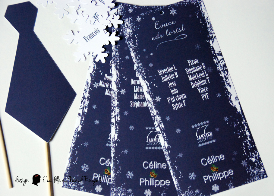 | Décoration papeterie mariage sur-mesure photobooth, plan de table, nom de table, étiquettes dragées, marque-place… Thème : la douceur de l’hiver Couleurs : bleu, blanc et une touche d’orange Accessoires : strass www.lafilleaunoeudrouge.fr |