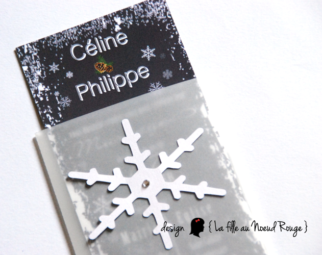 Il est dans un format haut agrémenté d’un flocon de neige en papier irisé avec un strass au centre. Dans cette pochette semi-transparente, il y a l’invitation accompagnée de flocon, givre et pomme de pin ainsi que le coupon dîner et le coupon adresses pour s’organiser pour le logement dans la même trame graphique.