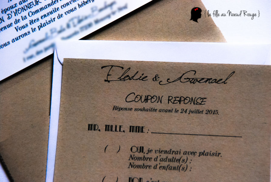 | Faire-part de mariage sur-mesure dentelle, kraft, étiquette et son coupon réponse assorti Couleurs : blanc, noir, kraft www.lafilleaunoeudrouge.fr |
