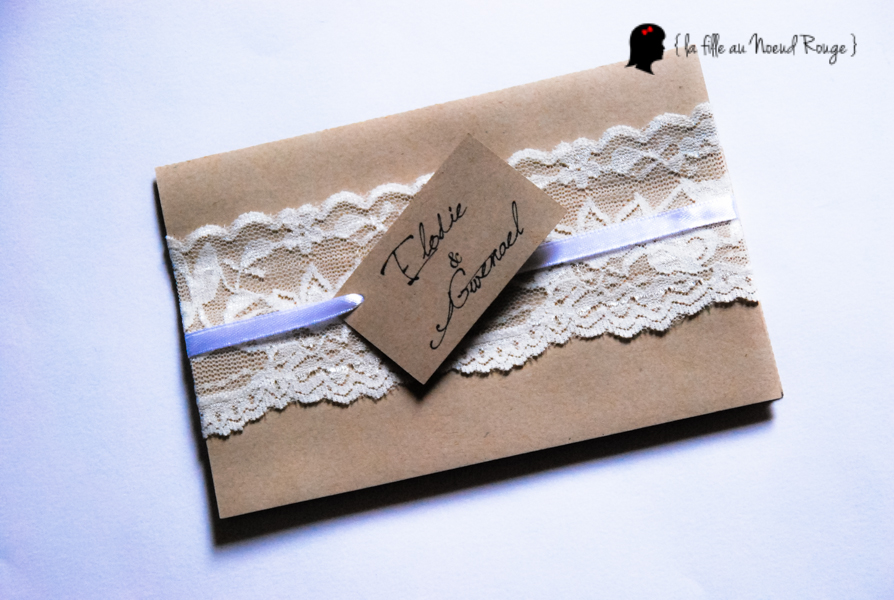 Voici le faire-part de mariage pochette d’Elodie et Gwenaël qui souhaitaient jouer sur la matière avec du papier recyclé kraft tout en y apportant de l’élégance avec de la jolie dentelle. L’étiquette avec les prénoms, placée sur la dentelle, donne ainsi du relief à l’ensemble.