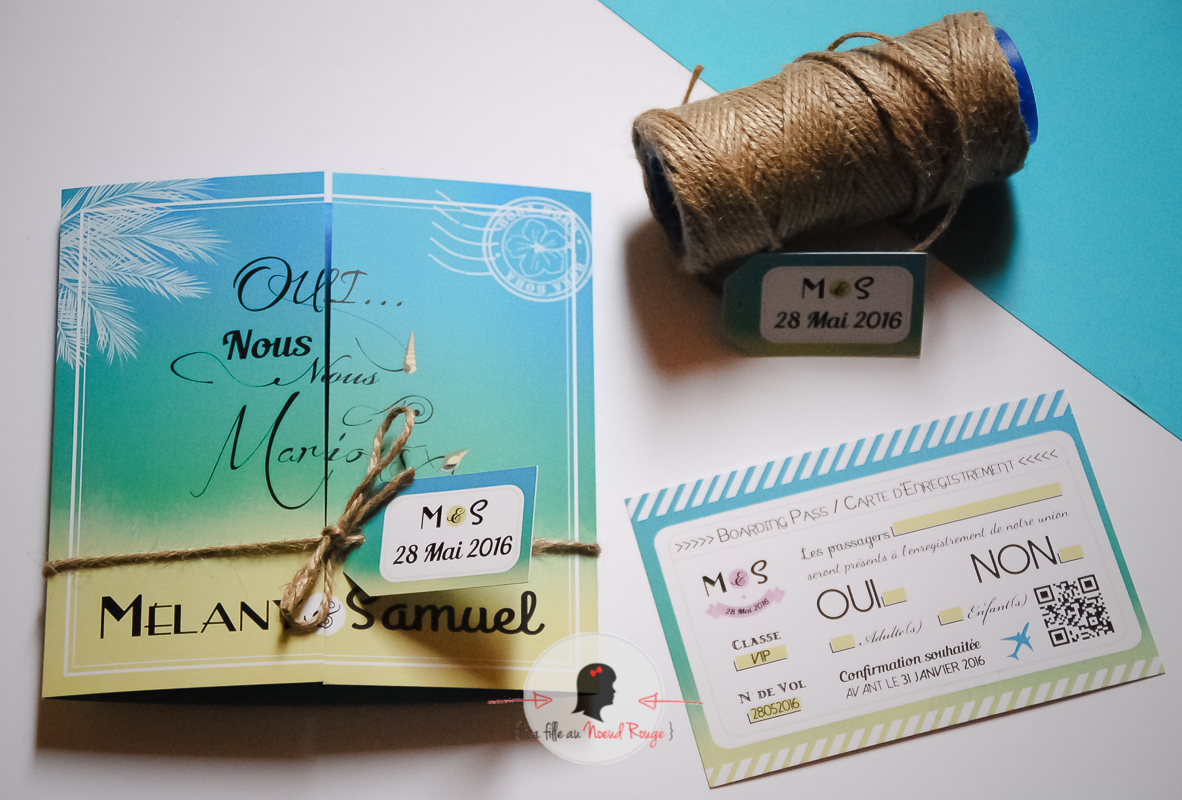 | Faire-part de mariage sur-mesure voyage mer sable plage coupon réponse assorti sous forme de billet de voyage zone à gratter, programme de la journée, icônes www.lafilleaunoeudrouge.fr |