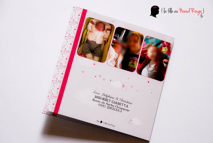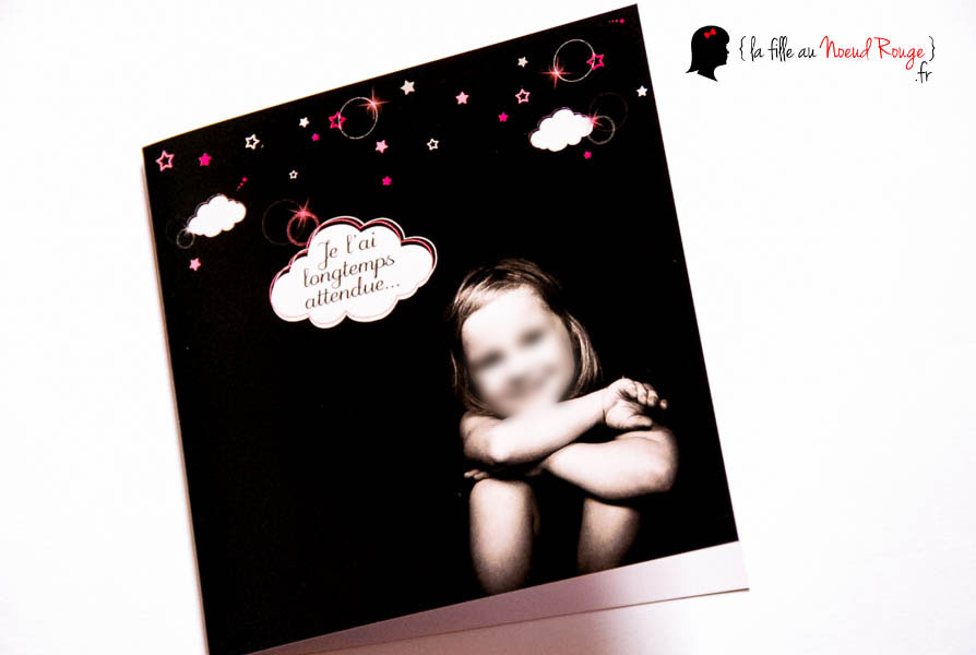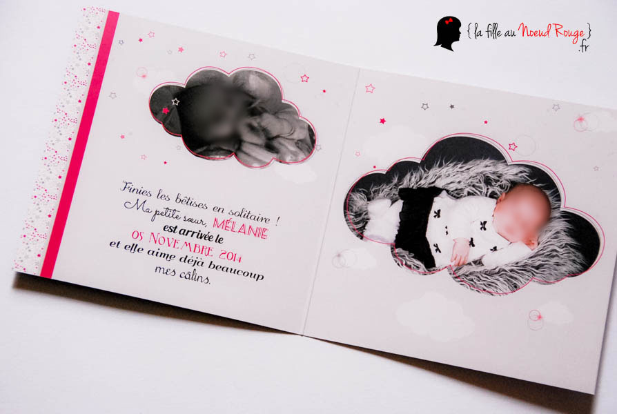 Ce faire-part est au format double pour ensuite y découvrir la photo de Mélanie, avec une étiquette en forme de nuage pour dire tout simplement « merci ».
