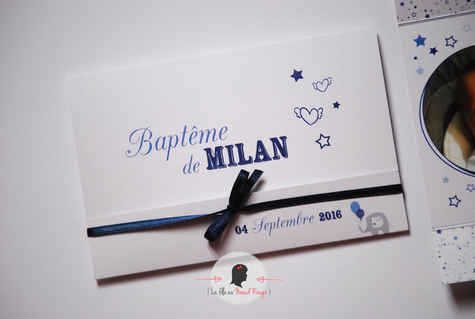 Voici le faire-part de baptême personnalisé de Milan sur le thème des étoiles dans des coloris bleu marine, bleu ciel et blanc délicatement fermé par un ruban fin dans un coloris bleu nuit qui une fois ouvert laisse apparaître sa jolie photo accompagnée d’un éléphant et des petits ballons.